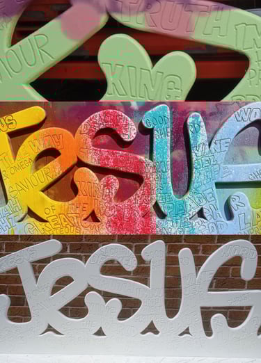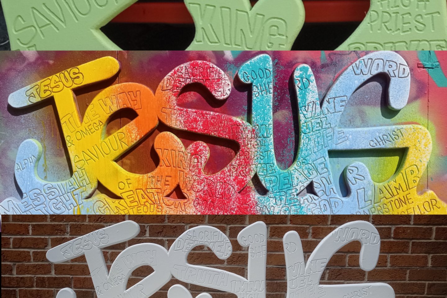 Above: Photos of a wooden Jesus sculpture, which began white and has been re-sprayed several times by lots of people. Engraved into it are different names for Jesus, such as 'Truth', 'Creator' and 'Saviour'.